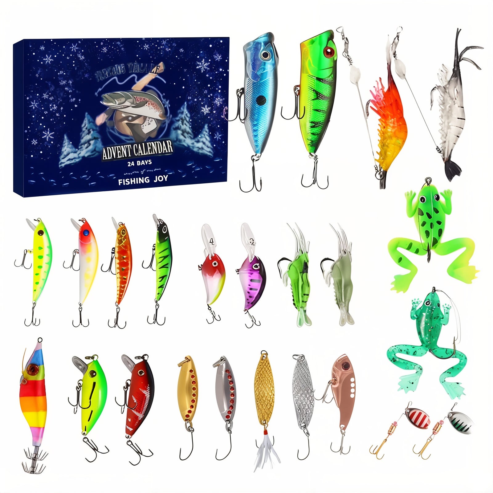 A curated mix of 24 fishing lures only — Includes varieties like crankbaits, soft plastics, topwater frogs, spoons, spinners, jerkbaits and jigs. Colors and styles vary by box for max fun and versatility.